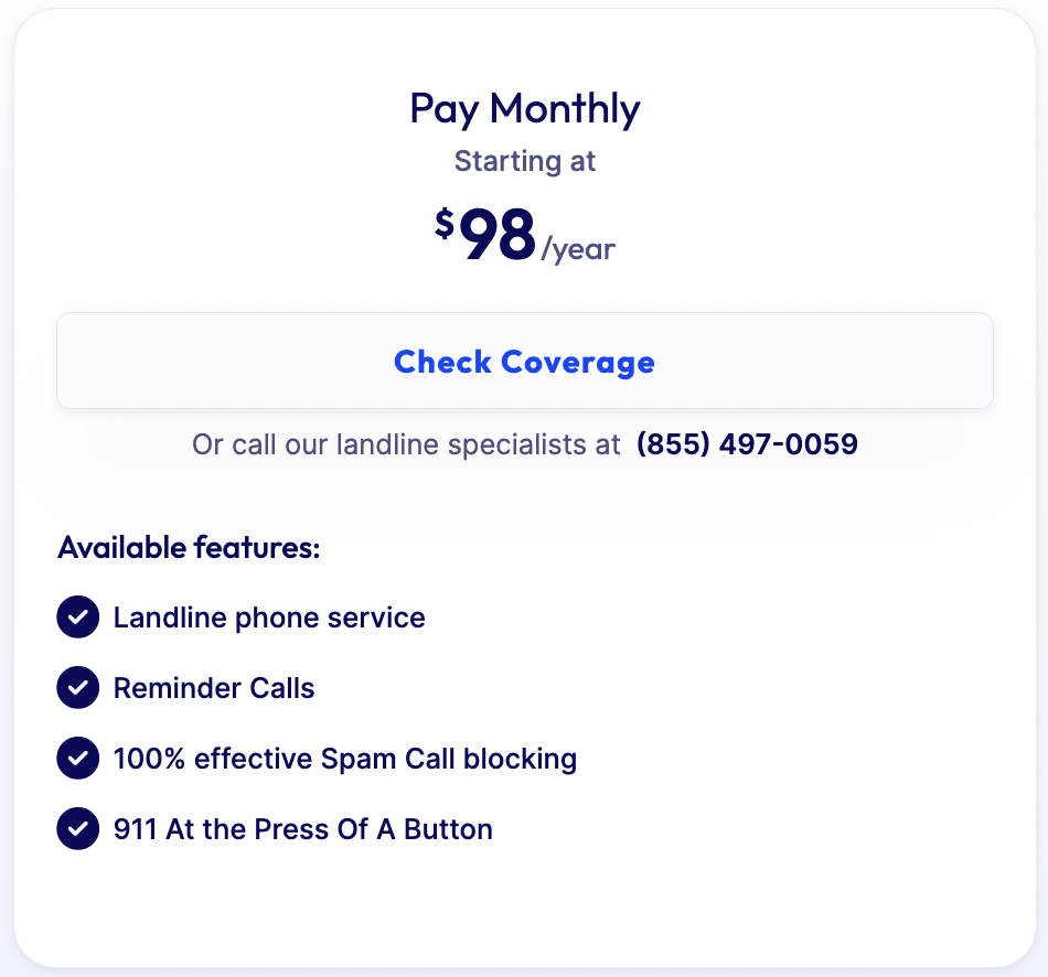 The Community Phone Caregiver Plan starts at $98/year, which includes landline phone service, reminder and care calls, 911 emergency protection, and spam-call-blocking.