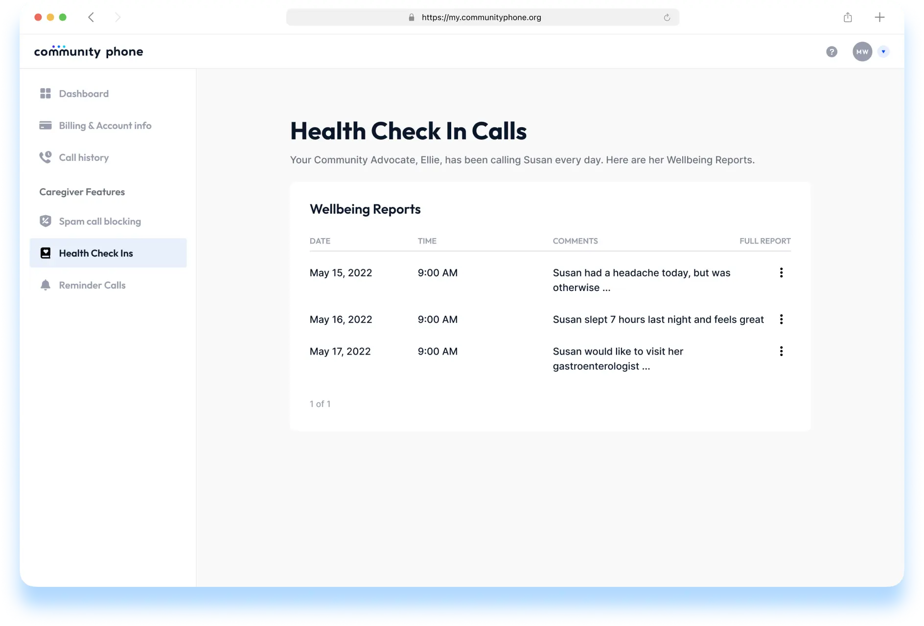 Community Phone's Caregiver plan provides the best check-in service for seniors by offering compassionate and experienced caregivers to give daily phone calls to elderly individuals.