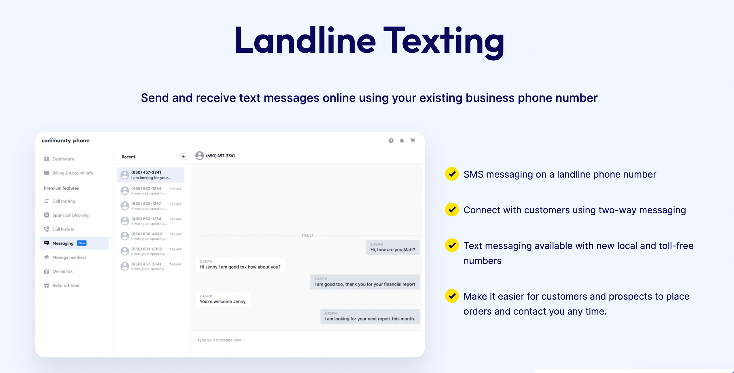 However, texting over landline requires using a landline provider that supports phone texting. Community Phone is a great provider for unlimited phone texting for homes and businesses. Click here to sign up at Community Phone today.