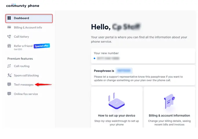 - Log into your Community Phone user portal at dashboard.communityphone.org