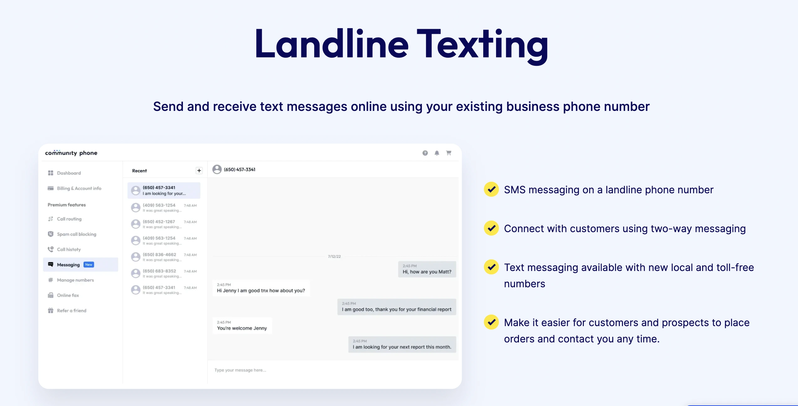 Have your customers place orders and update them about their order status via text messages online through your business phone number. Talk to Community Phone’s specialists to know more about this exciting feature!