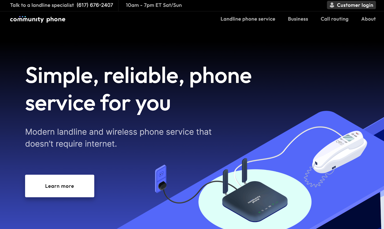 Unlike most competitors, Community Phone doesn’t require expensive internet or cable service connections to enable phone communications. All it takes is a Community Phone base device that connects to a nearby cell phone tower to provide a landline phone service.
