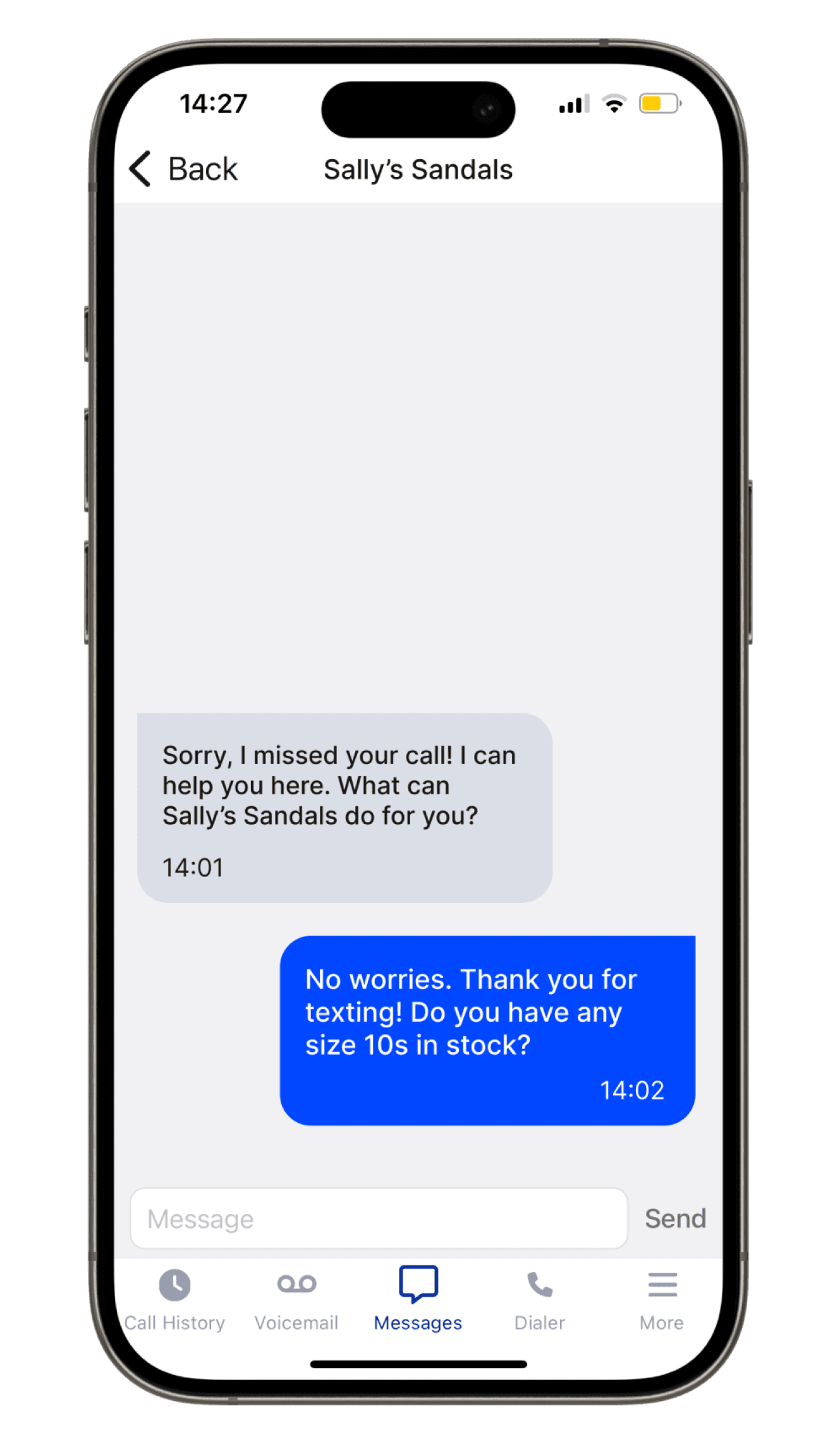 Receive voicemails as text so you can quickly review messages without taking time to listen. Use SMS to respond to client inquiries and keep communication smooth and professional.